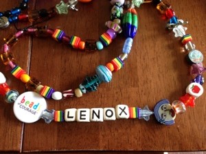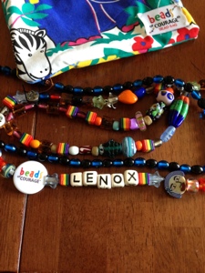 Another neat thing thing about the beads, is that there are beads relating to special accomplishments or acts of Courage – what is so special about these is that they are self-identified challenges and Lenox was able to hand select the beads from a beautiful selection of glass beads. For Lenox some of the special challenges/accomplishments we identified were : learning to take pills; creating and using a routine strategy to get through each needle poke/access; making the transition from consolidation to maintenance; making her own tough decision on whether to get a port again or deal with the pain and issues of having a new arm IV at each visit; going through 3 horrific sinus washes; and last but not least, the thing that Lenox considers to be the one most scary thing is having to do the “white medicine” which is where we carry her into the OR and they give her an initial anesthesia (that is white) that has her cough/gag and then crash out.