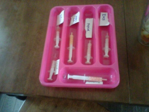 When we got discharged, instead of her port she had a PICC line, which is a central line that has external access (see pic). So its like a port, but remains “hooked up” outside her arm to a short IV line externally for easy non-needle access. And we needed that b/c we were being sent home with a new treatment for the CMV – twice a day home IV meds. At first we were pretty spooked at the regimen which required uber-vigilance for sterility and took about 1 1/2 hours each time (as though we had a spare 3 hours in our day) but it became fairly routine pretty quickly. If doing home IV meds meant going home, we were all for it. There were a few drawbacks to the new line, like weekly dressing changes (imagine ripping off super sticky band aids off the tender part of your upper inner arm), but Lenox was able to get back to school (albeit a little “riper”than usual, since we couldn’t give her a real bath with the PICC line). We also had to put her swim lessons on hold since the line couldn’t be submerged.